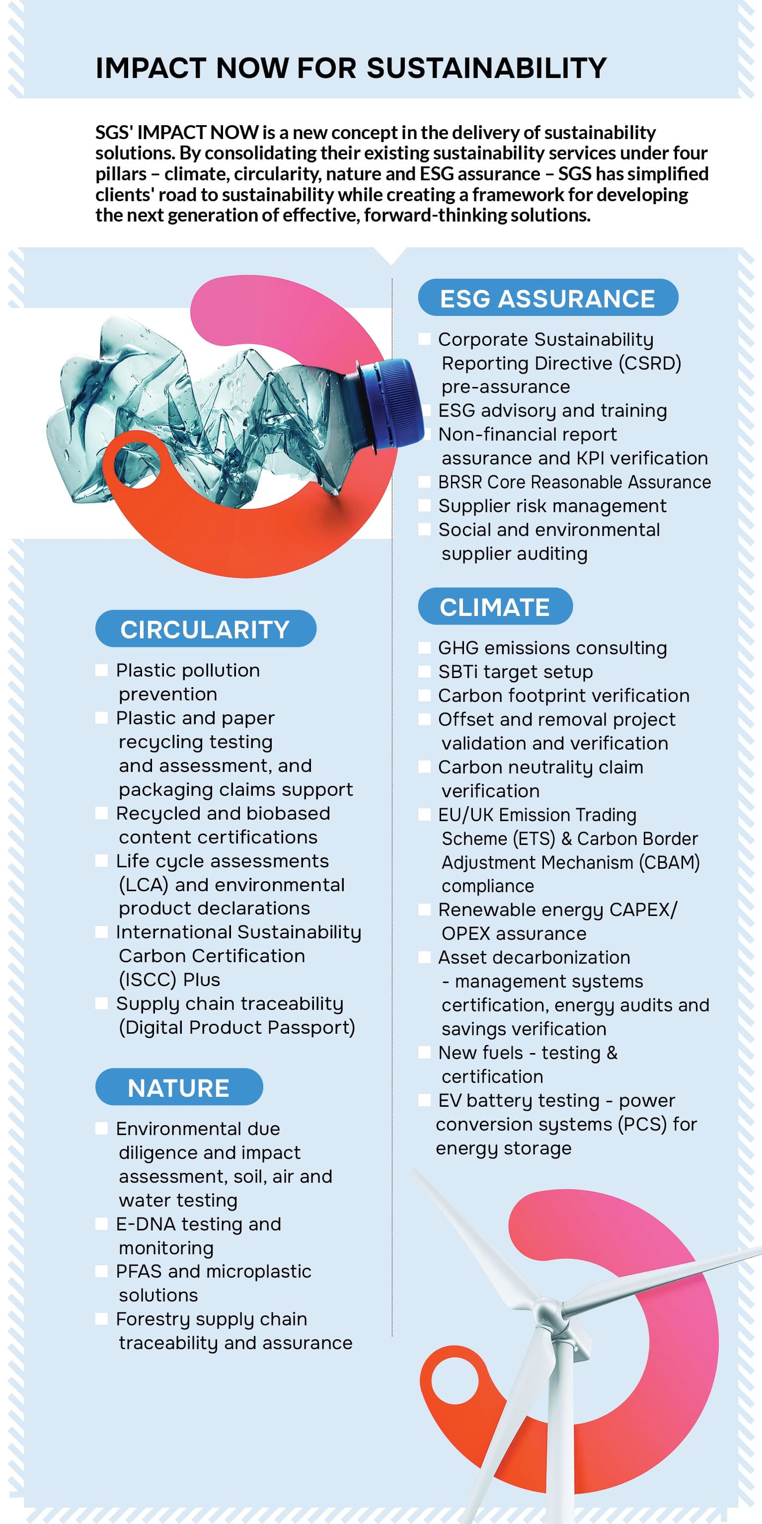 Our ‘Impact Now’ portfolio encompasses a comprehensive range of customisable services across Testing, Inspection, Certification, Assurance, Advisory and Value Chain to truly address every aspect of ESG. This holistic approach is what promises to help organisations across sectors, scales and phases of their sustainability journey. As a team of sustainability experts, we are equipped to handhold and deliver end-to-end services with respect to sustainability reporting, GHG accounting, value chain sustainability, ESG rating improvement, ESG strategy development, climate action and more.